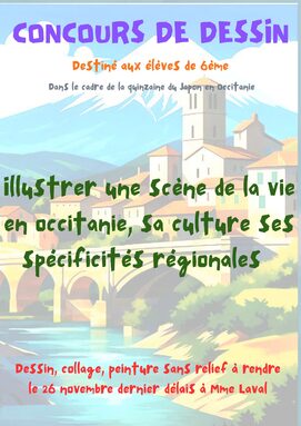 Concours de dessin pour les élèves de 6ème. A rendre à Mme Laval au plus tard le 26 novembre : travail de peinture, ou dessin ou collage sans relief en lien avec la culture ou les spécificités régionales ou une scène de vie autour de l''occitanie
