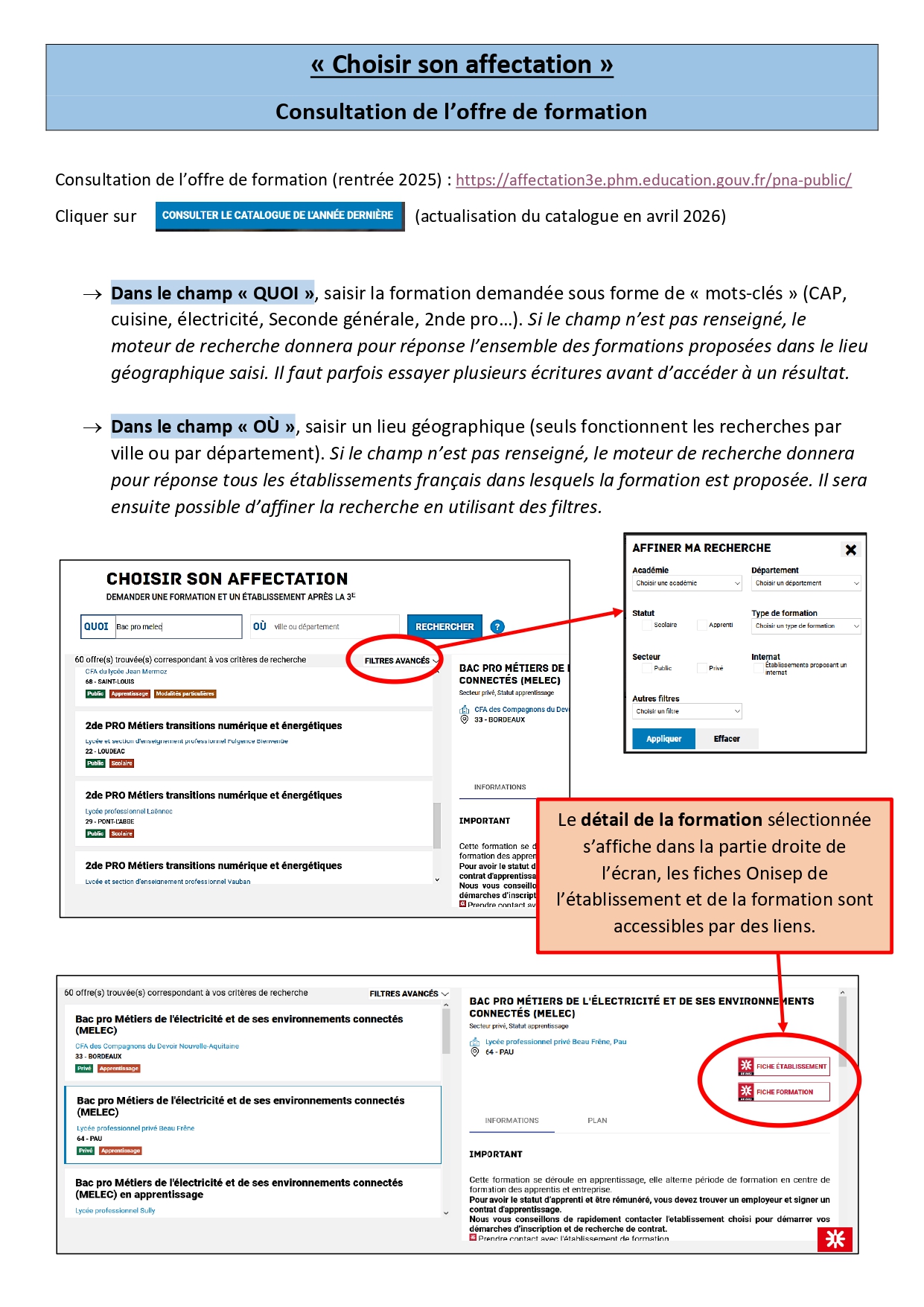 Ce service sera utilisé à partir du mois d'avril 2026 pour saisir les vœux d'affectation en lycée. Il référence l'ensemble des offres de formation sur tout le territoire national. Le catalogue 2025 reste accessible jusqu'à la mise à jour définitive du service, au mois d'avril 2026.