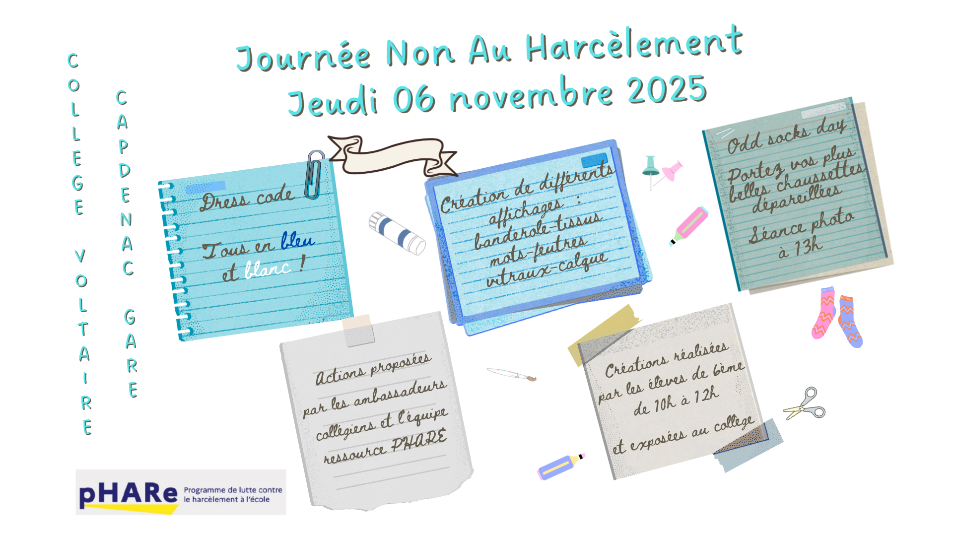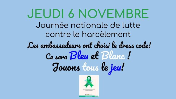 Le jeudi 6 novembre sera la journée nationale de lutte contre le harcèlement. Les ambassadeurs pHARe ont choisi le dress code bleu et blanc. Les élèves de sixième, eux, créeront des oeuvres visibles de TOUS ! Soyons solidaires!